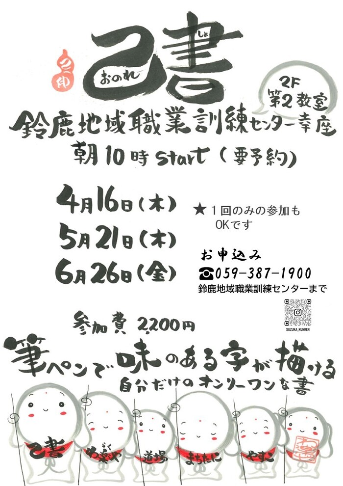 「己書(おのれしょ)」幸座を開催します(鈴鹿地域職業訓練センター)